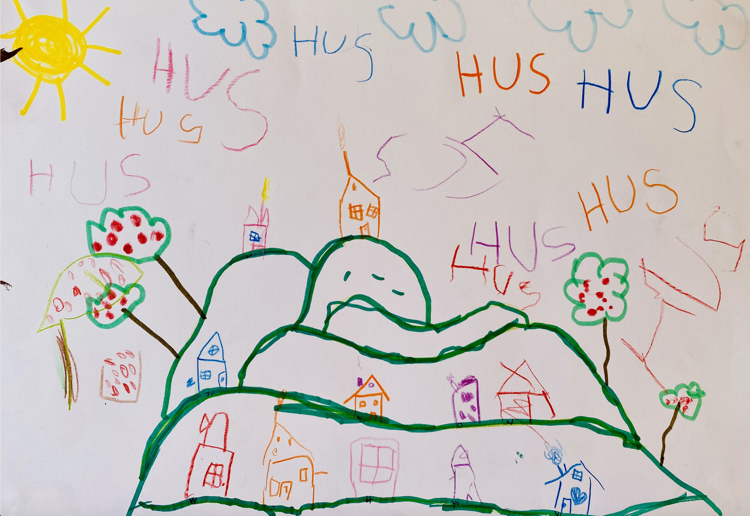 KVA ER EIT HUS? KVEN BUR I HUS? KVIFOR BUR VI I HUS? KVA GJER ME I EIT HUS? KORLEIS KJENNER DU OM HUS?DETTE VAR NOKRE AV SPØRSMÅLA ME STILLA BORNA I AGA BARNEHAGE, OGBA DEI TEIKNA OG SKAPA KRING DETTE MED HUS.