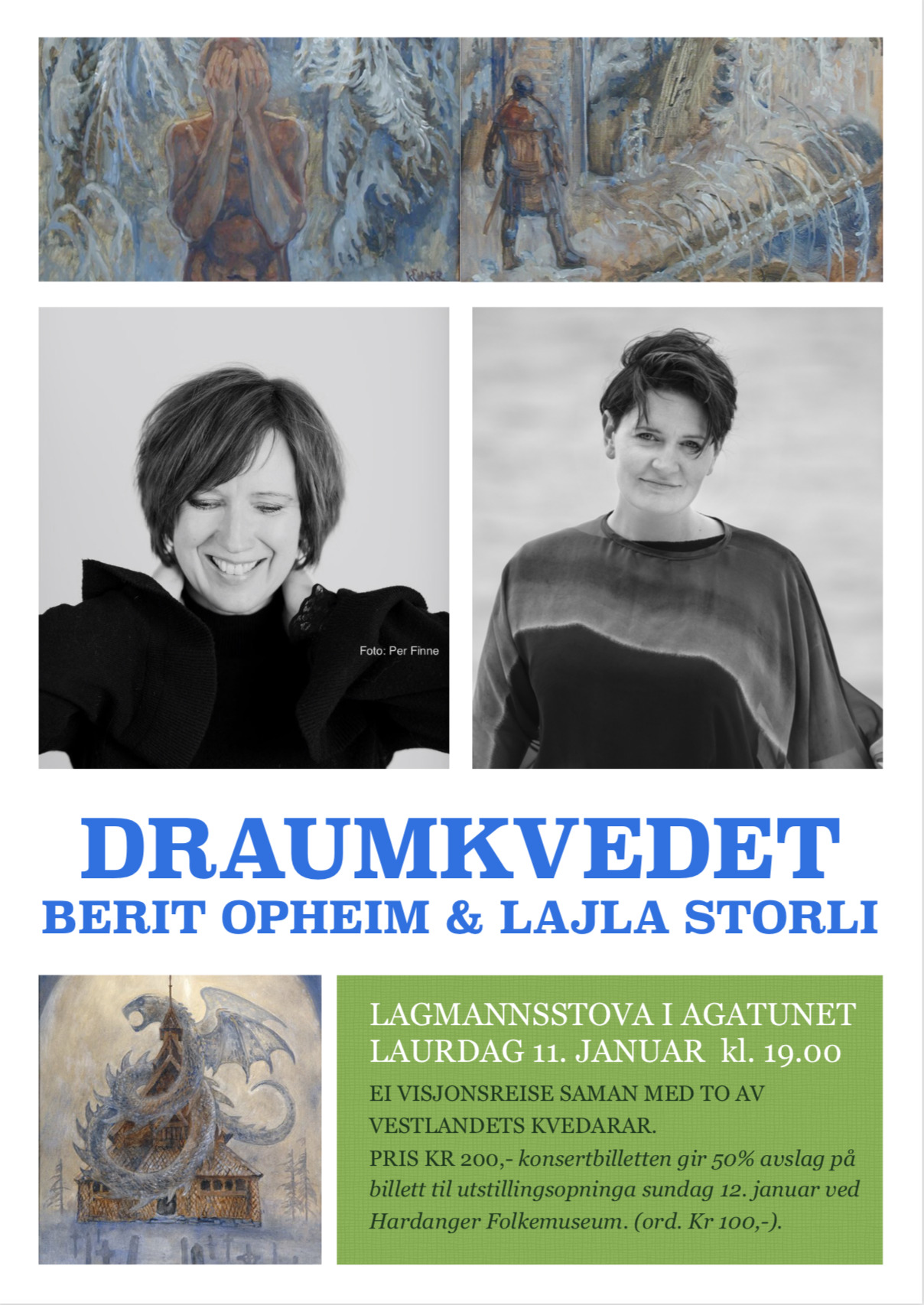 Balladen vert framført av Berit Opheim og Lajla Buer Storli. Dette er fyrste gong dei samarbeider, og dei gler seg til å framføre dette store visjonsdiktet, i ein versjon med nesten femti vers. Det er to av vestlandets flottaste kvedere som møtast, og dei skal formidla dette høgdepunktet frå norsk mellomalder i unike mellomalderrom i Hardanger, Kinsarvik kyrkje (10.1.20) og hjå oss i den den gamle Storstova i Agatunet – Lagmannsstova – som i år er 800 år.